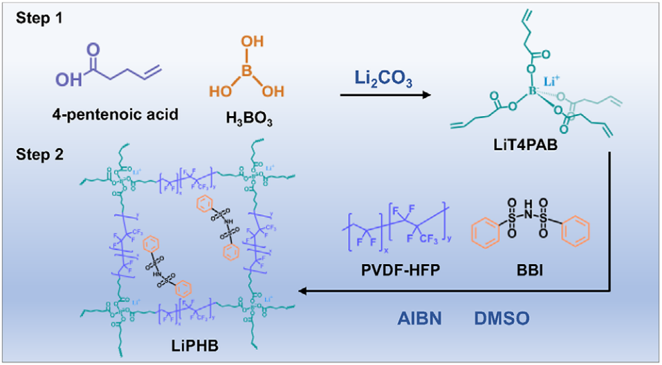 该研究提出了一种具有对称交叉结构和末端功能化C═C键的硼离子中心锂盐(LiT4PAB)作为单元,随后通过LiT4PAB与聚偏氟乙烯-六氟丙烯共聚物(PVDF-HFP)的化学交联构建了三维配位电解质(LiPHB)。由单键连接的硼离子中心单元表现出丰富的构象转变,在二苯基磺酰亚胺(BBI)的静电相互作用辅助下,实现了LiPHB的可变形结构。因此,LiPHB在受到冲击时能够发生自适应变形,表现出良好的延展性,弹性模量为1.4 GPa,最大伸长率为447.4%。此外,LiPHB展示了三维单锂离子传输通道,可引导均匀的锂沉积。结果表明,锂对称电池在30 °C和0.1 mA cm⁻²条件下能够稳定进行沉积/剥离循环超过1500小时。Li/LiPHB SICPEs/NCM811固态电池在30 °C和0.2 C倍率下循环150次后容量保持率为90.3%。该研究为动态单离子导电聚合物电解质的设计策略提供了新的思路,适用于固态电池。